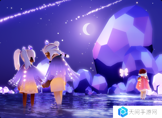 光启共鸣 2月12日~2月25日,通过云巢与遇境的同心节向导即可传送至活动场景。夜幕下群星与沙砾静谧不语,几丛水晶错落其间,折射出梦幻光晕,在水面漾起紫色的涟漪。