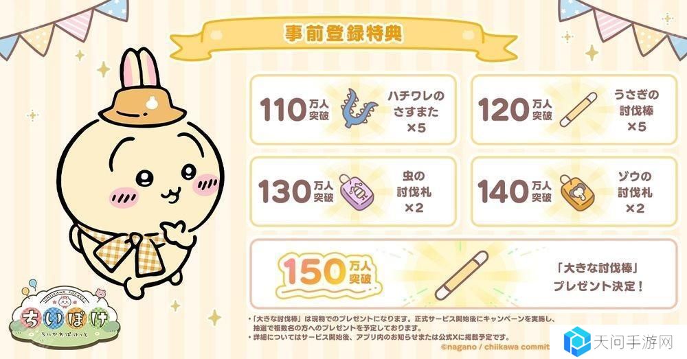此外,事前登录人数达成 150 万人时的奖励已追加。当达成 150 万人时,将举办实物「巨大讨伐棒」的抽奖活动。
